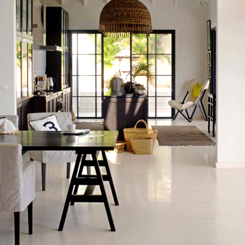 I love the large doors that bring light into this house (image above). The dividing walls define the space without chopping it up, while the white floor creates continuity between the kitchen and the dining room.