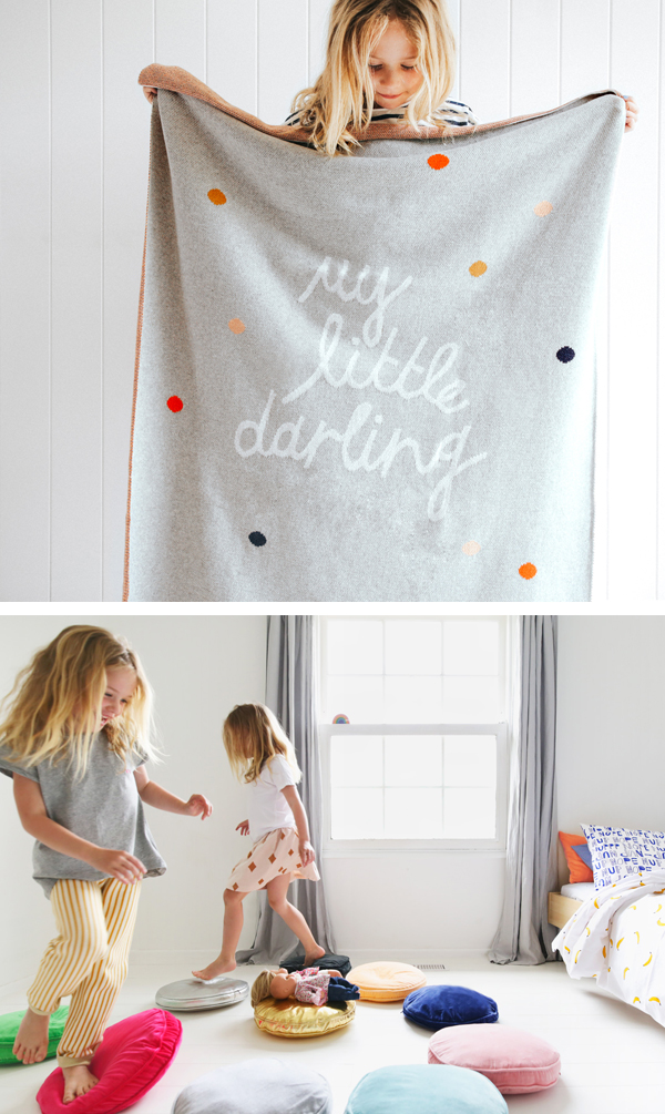 Australian designer Rachel Castle is a talented lady that I have been following for a long time now. I love her Instagram feed as Rachel has a great sense of humor and her whimsy design remind me that I need some pops of color in my home. I recently ordered the beautiful Love tea towel (can’t wait for it to arrive!) and I will frame it (as in the image below) to be hung in my son’s bedroom. I will show you the result when it is finished! About the Castle brand: “Castle loves having a bit of fun. We love color and whimsy. We love making accessible art and beautiful bedlinen. We love spots and fluro and pink and yellow and orange and grey and love hearts and flowers and paint and felt and everything that POPS around in our studio. If its fun we love it.” Rachel has spent the past 20 years in the homeware industry both in Australia and the UK, and currently lives in Sydney. Founded in 2008, Castle has become a haven for lovers of all things sunny. Many of their cotton bedding products are being made in Australia whilst all of the artworks are sewn, screened and painted by Rachel Castle. In this post you can find some of favorite items. I hope you love them as much as I do! Above: limited edition Rainbows print | jumbo floor cushion