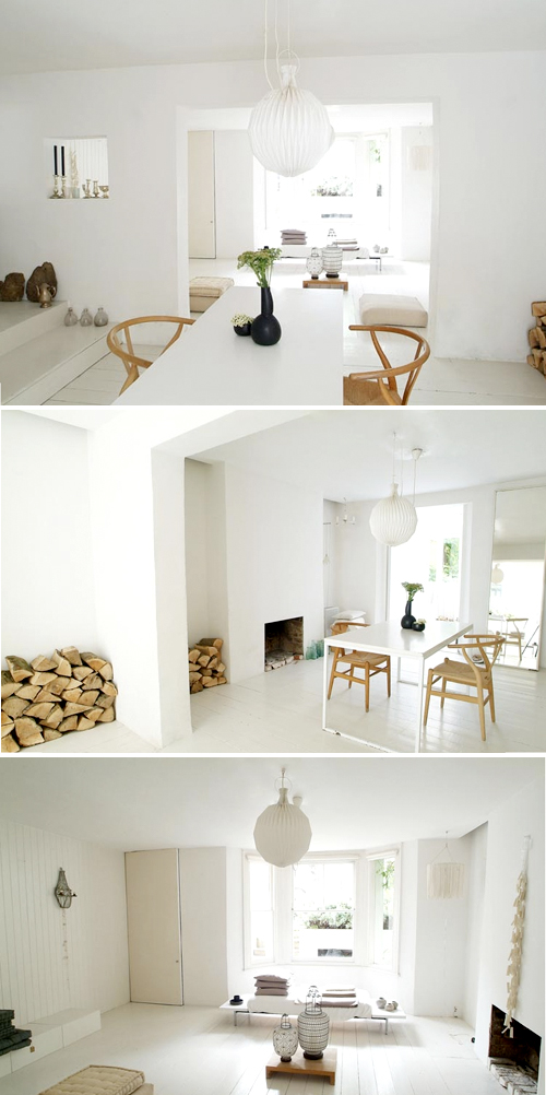 I also love the natural elements (wooden chairs, fire wood etc). They really do well with the white walls and floors.