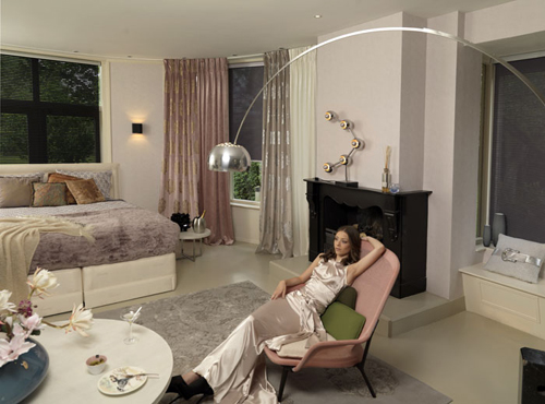 The decoration is luxureous with a surprising mix of classic and modern elements. For instance, a classic bed from Vi-Spring is combined with the Vitra Slow Chair.