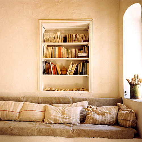I love the top photo with that beautiful bed. The grey wood was found in the house when the owners moved in. They turned it into a bed, it is that simple! In the living room (photo above) a small alcove functions as a library.