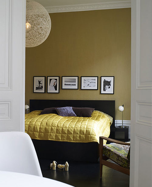 The bedroom wall has a lovely mustard yellow colour. The pendant lamp (Random Light) is from Dutch designer Bert Jan Pot.