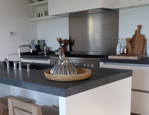 The countertop is made from engineered stone. This material is more durable than concrete (which stains easily). The grey colour make it look like concrete.