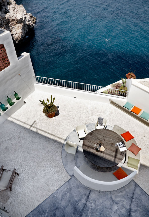 This ancient stone home owned by Danish couple Lars and Pernille Lembcke looks across the Adriatic Sea. The beautiful house is located in the town of Polignano in Puglia, the ‘heel’ of Italy. “From the outside it just looks like a normal town house, but as soon as you enter you are dragged by the light to the sea-facing kitchen and out onto the large terrace courtyard that hangs 20 meters above the water,” she says. “The first and last thing we do every day is inhale the sea. You can read more about this home on the Kinfolk website.