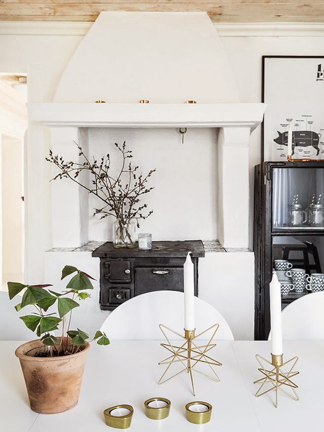 This beautiful country cottage is situated in the middle of a forrest in Sweden. The home, which was in built in 1929, is decorated in a modern country style mixed with vintage pieces. Steel and concrete give a slight industrial touch. The beautiful black cabinet in the kitchen (image no. 6) was made from old windows that were found when the owners moved into the old house. A very lovely bright family home!