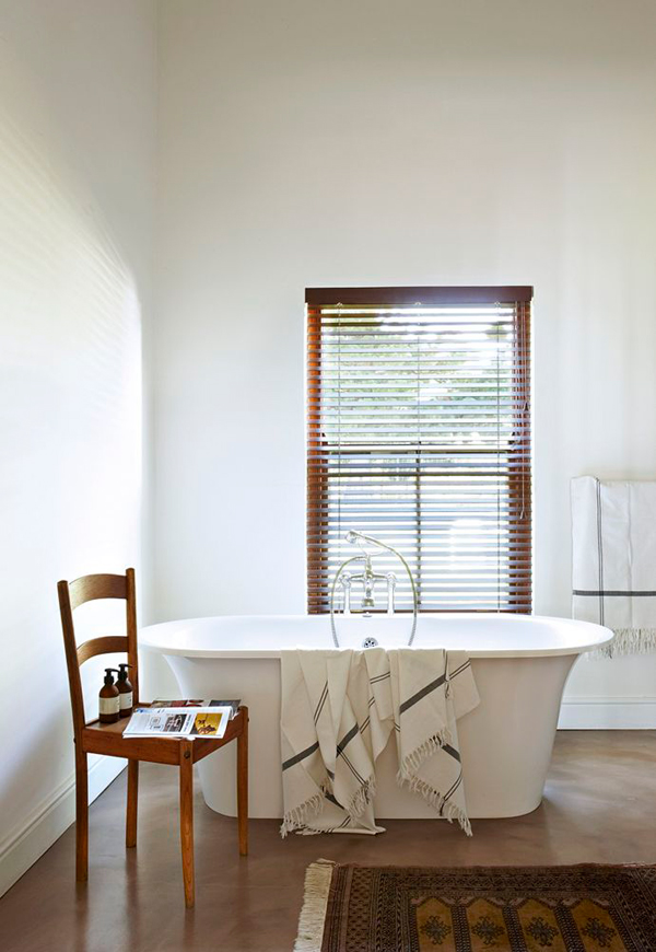 This beautiful Cape Dutch style farmhouse is idyllically situated near Hermanus, South Africa. It is home to a young family of four and a boutique wine label. On the outside you see a beautiful white, thatch-roofed homestead surrounded by a green lawn and white roses. The interior is a laid-back-sophisticated style – with dark wood, worn leather and various shades of white. My favorite part of the house is definitely the open roof open plan living room and kitchen.