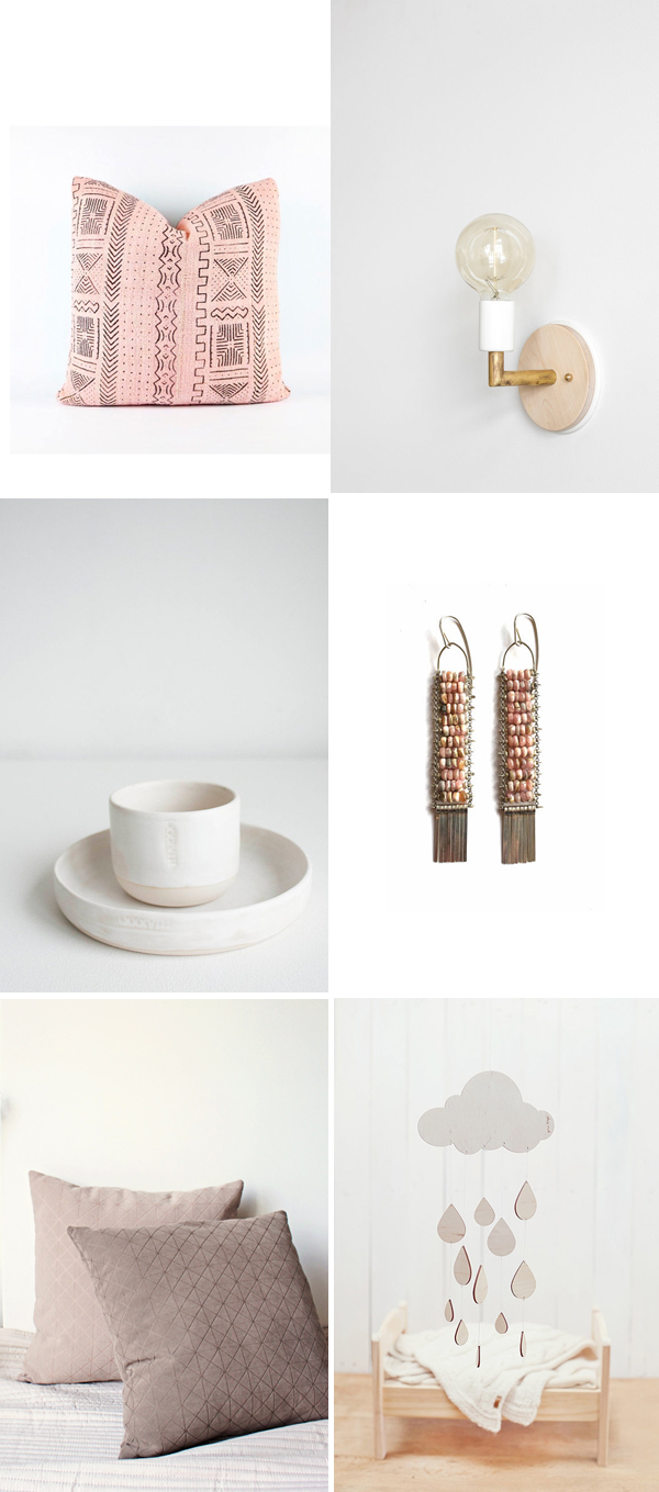 1. blush pink African mudcloth pillow cover | 2. raw wood & plywood wall sconce | 3. hand thrown ceramic set | 4. ladder earrings with blush pink rhodochrosite beads | 5. nursery mobile | 6. pale geometric pillows.