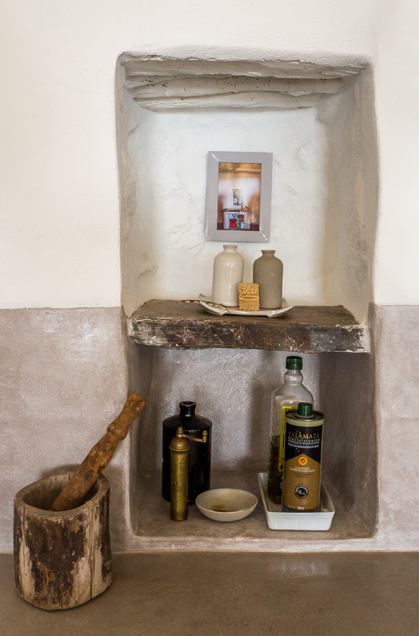 Owner Carey about the renovation: “Upstairs the detached cottage had a small dark kitchen and one room where the family slept and lived. Downstairs they kept their animals in the arched stone ‘camara’ area. We knocked the two rooms upstairs through into one big living space, added a polished concrete open-shelved kitchen area and replaced the rotten floors with some ancient wide ‘white oak’ boards from an old Turkish ship (found in a reclamation yard in Athens). Downstairs we lowered the floor to give more headroom, white-washed the thick stone walls, and enlarged the tiny window so that we could create a bedroom that was both light and airy. We re-used the original external French doors from the upstairs room as doors for the new built-in wardrobes in the bedroom. The shower room was created within the old ’sterna’ downstairs – the cistern area for collecting rainwater. The shower room has polished concrete walls and flooring, shelves made from the same Turkish boards we used upstairs, and an old marble wash basin found in a reclamation yard. You can see the sky through the sky light above when you are showering in the spacious shower!”