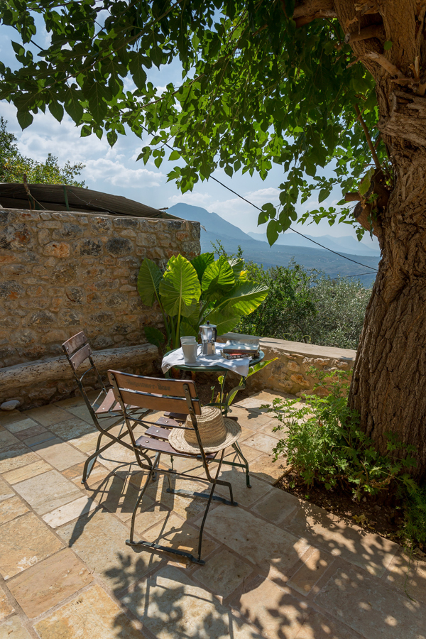 A few years ago I posted about a renovation of an old fisherman’s house in the town of Koroni in Greece. The owner of this lovely house has sent me some images of another home that they have renovated in Greece. This little house is located in a traditional hill village above the beautiful and historic seaside village of Kardamyli in ‘the Mani’ area of the Peloponnese. This is an area of dramatic scenery, winding roads, mountains and gorges, fishing villages, and the home of the delicious Kalamata olives! When Carey found the cottage it had not been lived in for 70 years and had no bathroom or toilet. What they loved about the cottage was the beautiful views from the upstairs room. A new roof, new electrics and plumbing turned this little cottage into a beautiful home once more. Outside a balcony was added to take in the spectacular view all the way down the coastline. The garden was paved with local stone and some additional terraces made for sitting out.