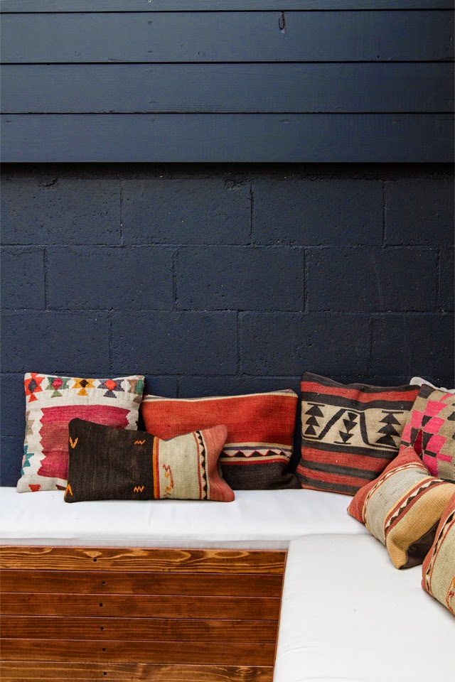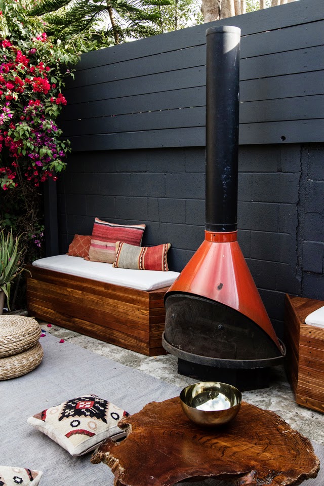 I love this cozy outdoor area in Los Angeles, USA. The backyard belongs to designer Sarah Sherman Samuel who created a boho chic look with kilim cushions and a vintage fire place. You can see more about the renovation of her backyard on Sarah’s blog. At the end of this post you can find some suggestions on how to create a similar look yourself.