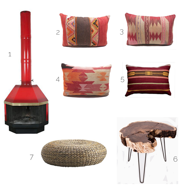 1. vintage Malm fire place | 2. kilim cushion cover | 3. kilim cushion cover | 4. kilim cushion cover | 5. kilim cushion cover | 6. wood slice table | 7. banana leaf ALSEDA pouf.