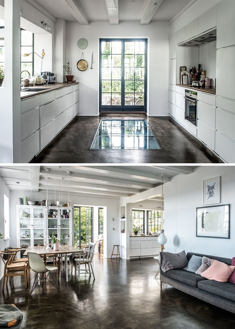I love this home, comfortable and scandi-rustic and modern …is that a glass floor/’skylight’ in the middle of the kitchen?