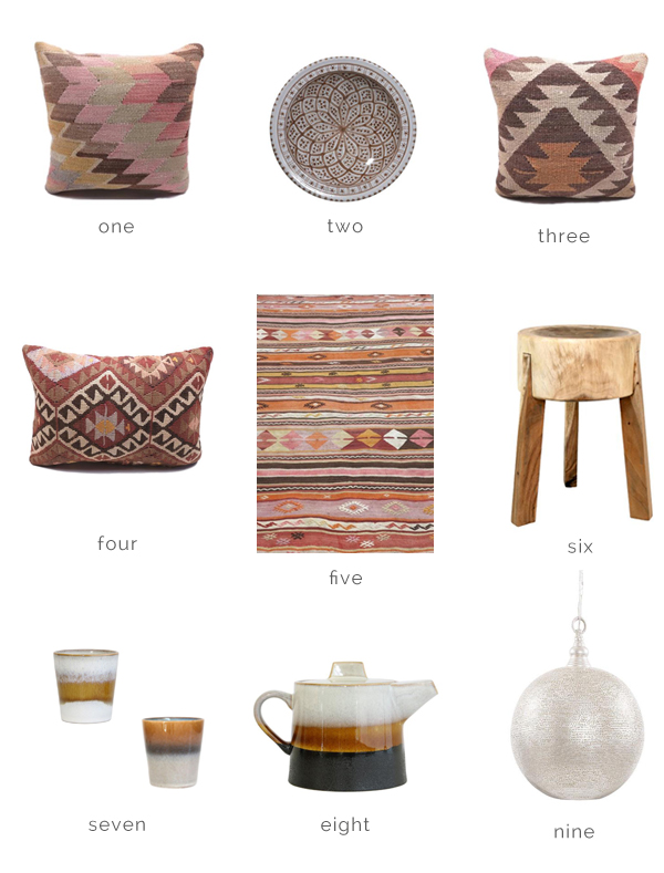 1. kilim cushion cover | 2. ceramic bowl | 3. kilim cushion cover | 4. kilim cushion cover | 5. vintage kilim rug | 6. rustic wooden stool | 7. ceramic cups | 8. ceramic teapot | 9. Egyptian copper pendant.