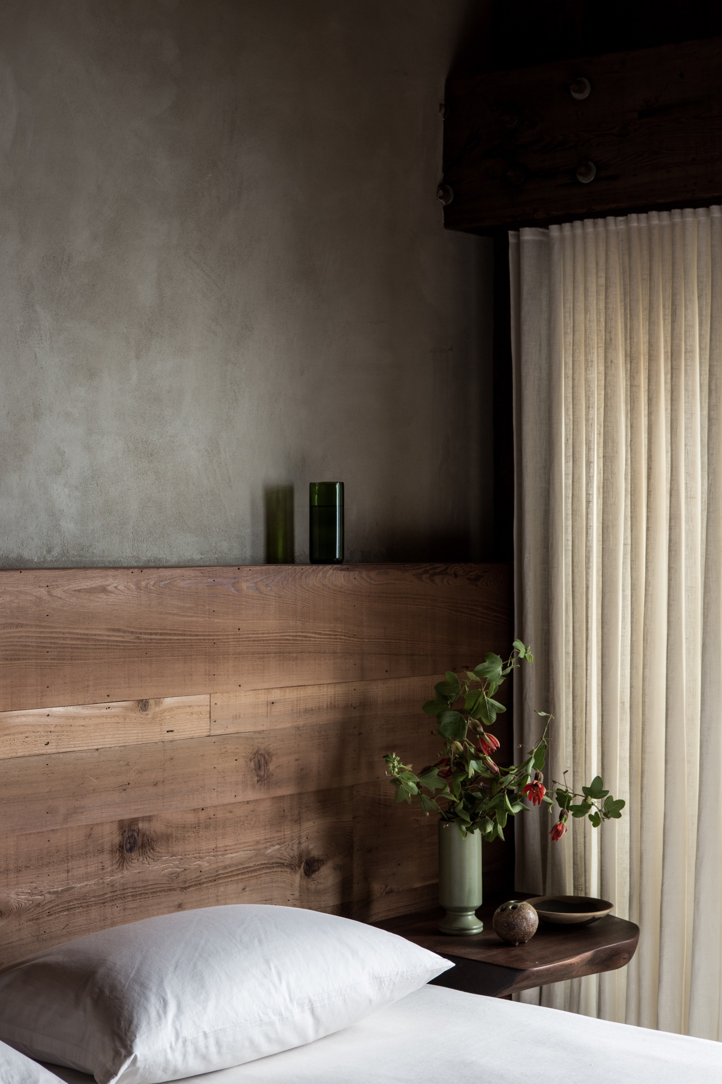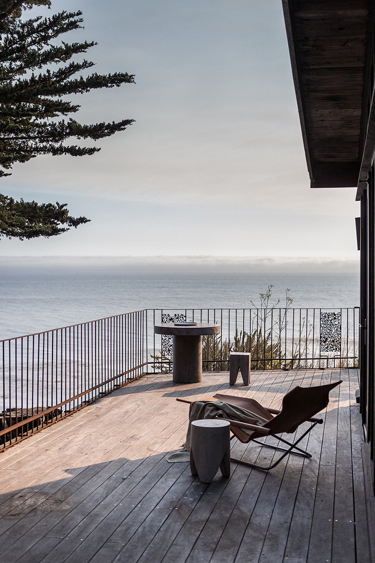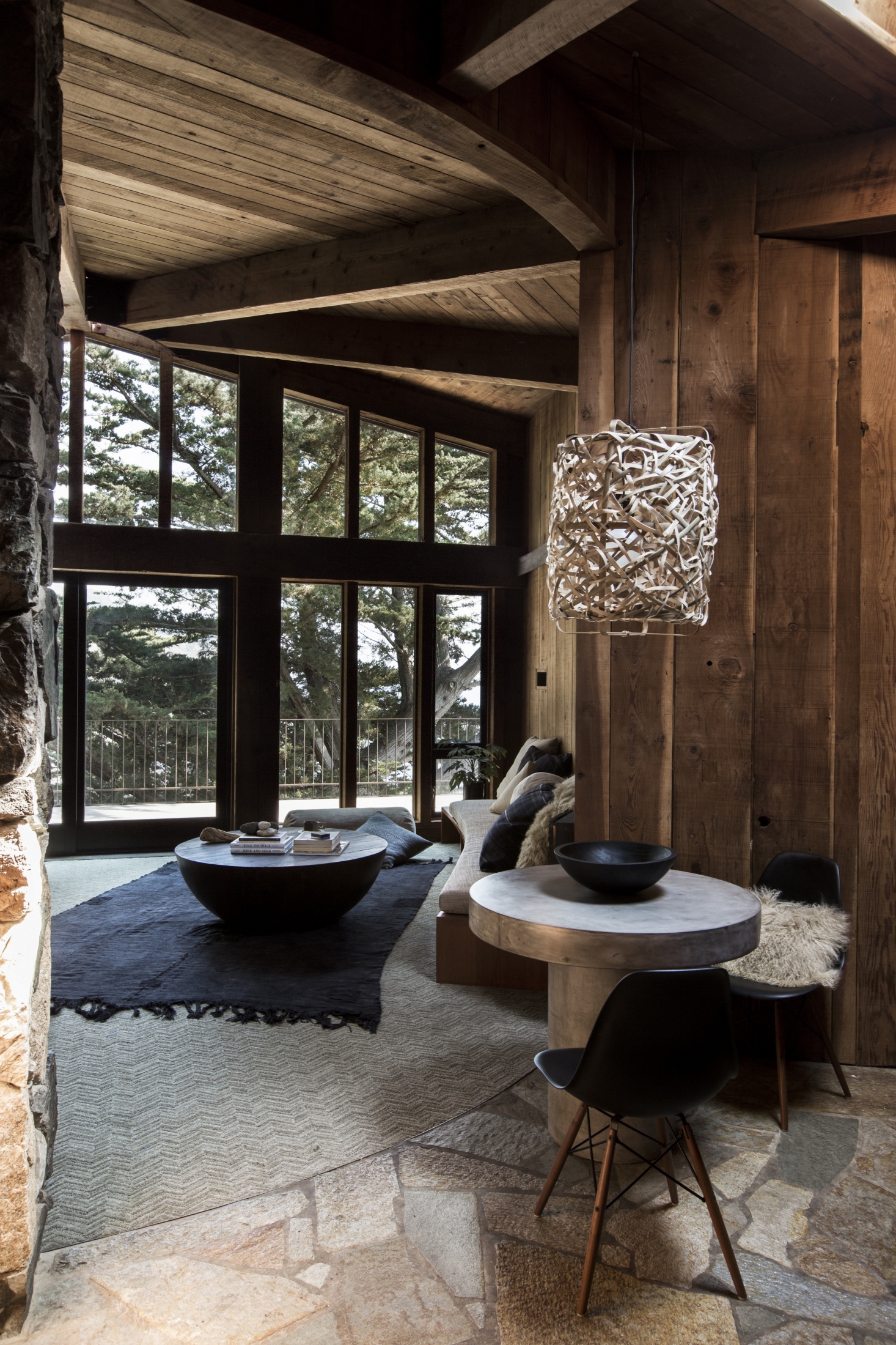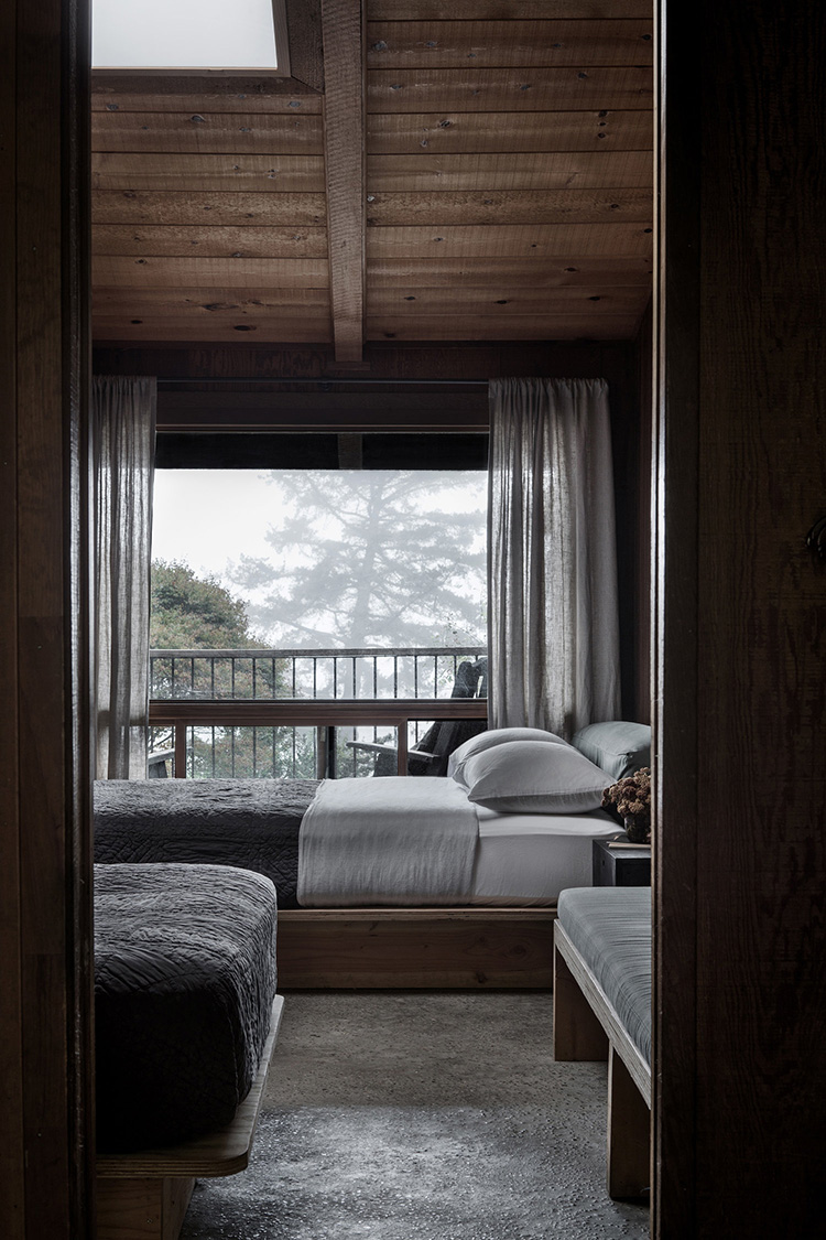 Interior designer Carissa Duncan of Salt + Bones was asked to redesign the guest rooms of Esalen Institute in Big Sur, California—a New Age retreat center founded in 1962. As well as updating the room in the Maslow & Watts buildings with modern comforts, Duncan was also tasked with breathing new life back into the spectacular semi-circular Fritz House. Built into the cliff edge overlooking the baths, the Fritz House was constructed in the 1960s from locally harvested old growth redwood and beautiful hand hewn stone, all of which needed to be sanded and refinished. The building became a meeting space in the early 1970s, and its carpets, furniture, and wood cladding had been unchanged since. Duncan was charged with turning it back into a residence.