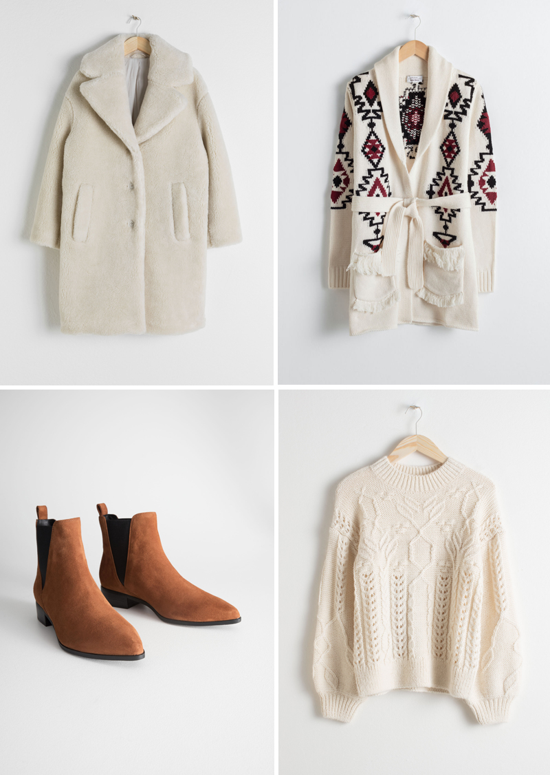 faux shearling coat | south western knit belted cardigan | floral cable knit sweater | chelsea boots