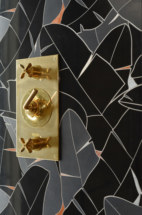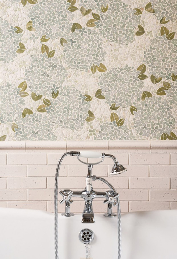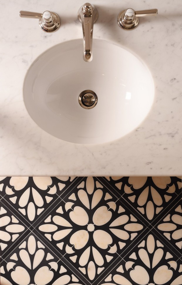 I came across this image (above) and I had to find out more about those beautiful tiles. They are made by Canadian company Mosaiquesurface which recently launched their new French Quarter Collection which includes 30 different mosaic patterns available in nearly 100 types of natural stone. In addition to the variety of stone types, 16 colors of Venetian glass and metal inlays are available. The Montreal based manufacturer introduced its newest collection in four “stories,” or sections. Each is inspired by the luxe interiors of old homes in the American South.