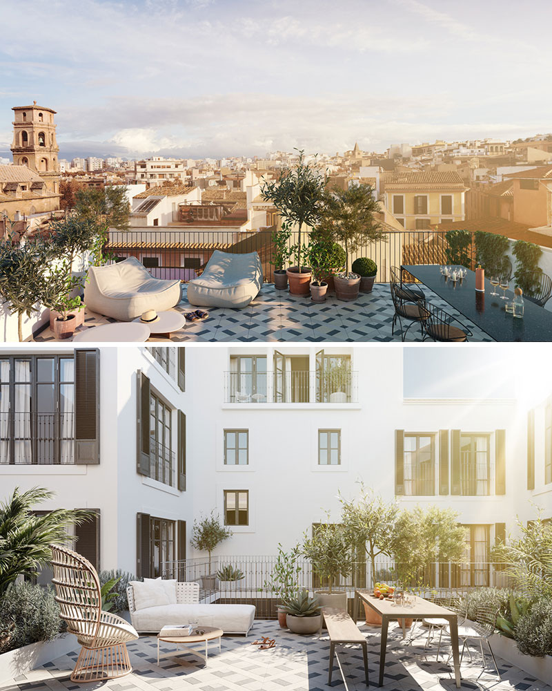 First of all, my apologies for my absence! Life has been hectic for the last couple of weeks. Selling our home and buying a new home (more about that in a later stage) have completely absorbed my time. The next few months will remain busy but I promise that I will post more frequently! Today we visit the Spanish island of Mallorca where an historic 400 year old building in the city of Palma de Mallorca has been beautifully renovated in a living complex of 12 highly personalized apartments and an amazing open patio with a pool and lounge area at the heart of it all. The apartments all have their individual angles. Most have private terraces and balconies, which extend the social area. On the first floor, which is the original ‘planta noble’ of the house, the apartments instead have winter gardens and extra ceiling height. And what unites all apartments is the very heart of the building – as most residents have a view towards the lush open-air garden and pool area with sun, shade, lounge groups and a guest apartment. The design of this apartment complex called Impremta Garden is a collaboration between Spanish architects AVW Arquitectura and Swedish interior design studio Whyte Lilja. I have been to Palma and I can say that it is a beautiful city. It’s easy to sense the centuries’ presence as you walk the narrow streets of Palma’s Old Town. This inner city, which was formerly an Arab ‘medina’, with city walls and a seafront bustling with pirates, merchants, explorers and invaders – was the Mediterranean gateway between Africa, Europe and Turkey. Layers upon layers have shaped the city as we know it today, and many of the older structures bear countless dramatic anecdotes, tales and more or less unconfirmed war stories.