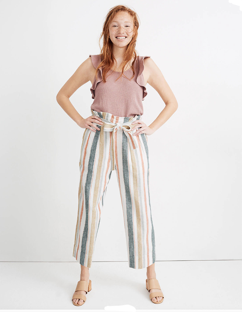 Above: Tie-Waist Huston Pull-On Crop Pants in Stripe | Ruffle-Sleeve Tank Top in Rosebud. This outfit would be perfect with these sandals.