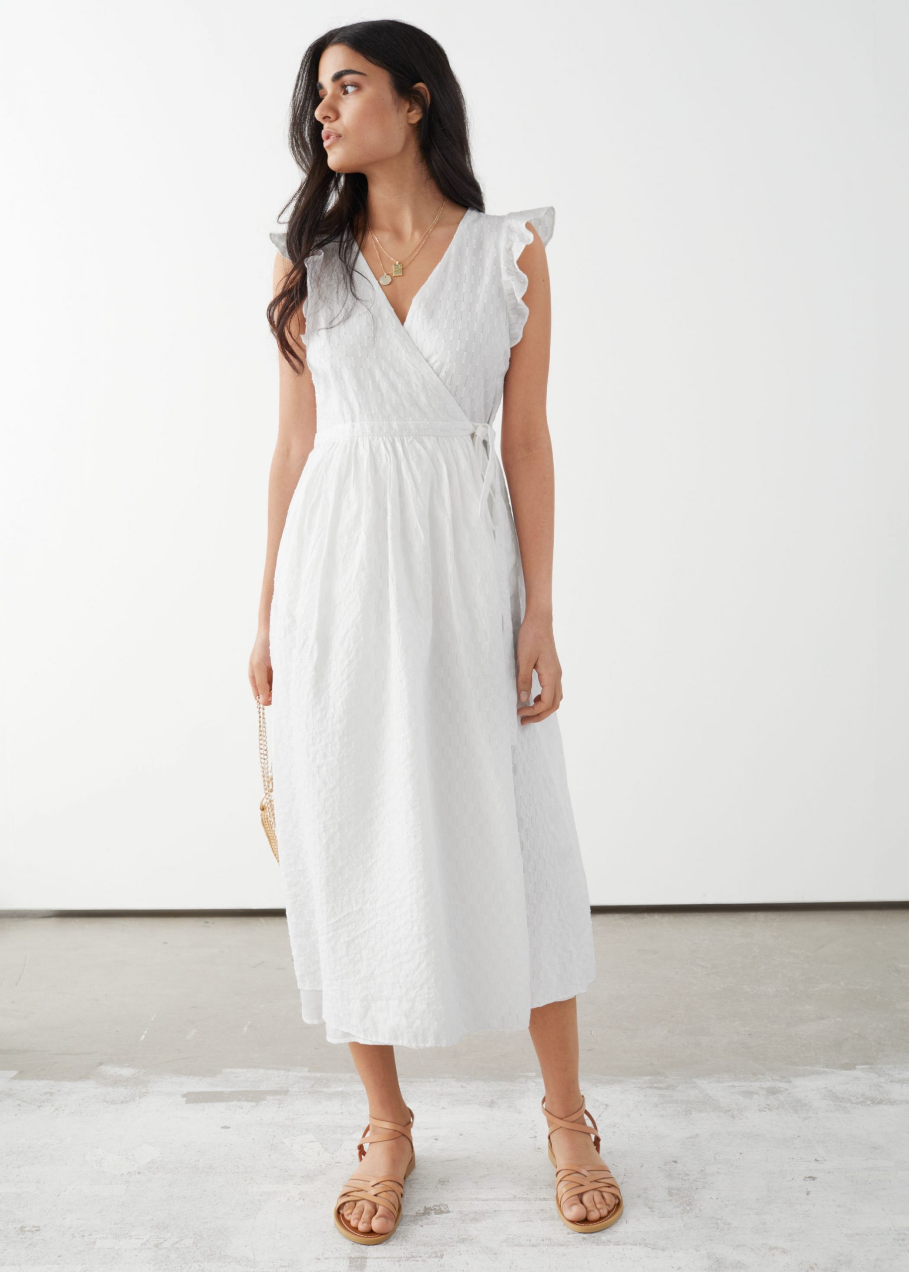 Above: puff sleeve midi dress in light blue | straw crossbody bag | leather sandals | rope sandals | white v-cut swimsuit | floral bikini top | floral briefs | straw tote bag (sold out) | midi wrap dress