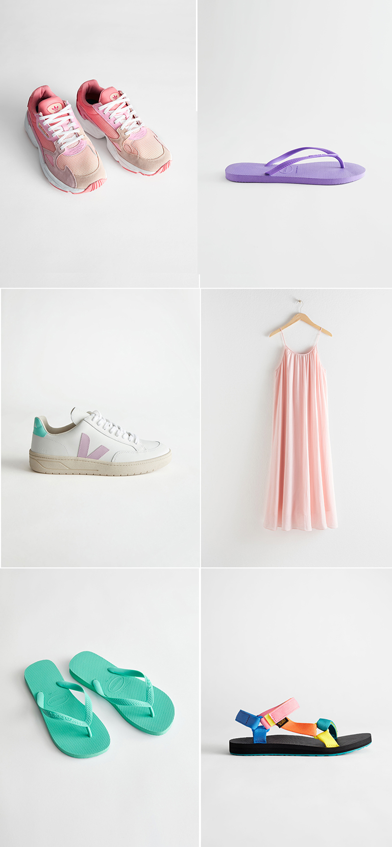 Above: pink Adidas sneakers | purple Havaianas flip flops | Veja sneakers (I also love these pink ones) | pink dress | green Havaianas flip flops | rainbow Teva sandals.