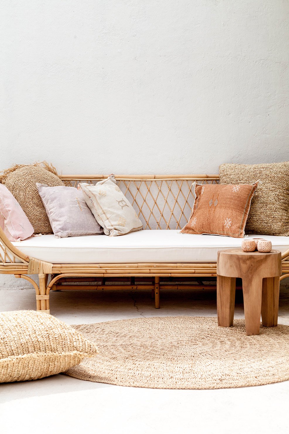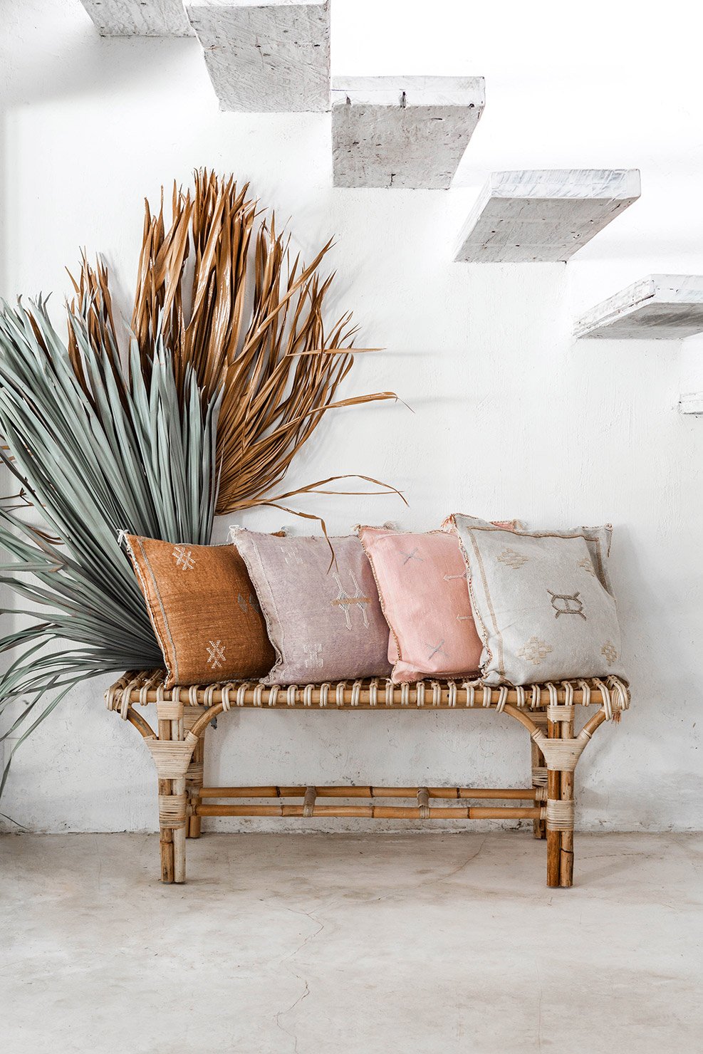 To create a bohemian style interior you can use furniture pieces made natural material such as rattan or cane. Yak and Yeti Trader has some beautiful pieces in their collection. Their designs are inspired by nature and are ethically made by skilled artisans. You can find their collection here. The cushions in the images are made of cactus silk and are a perfect addition. Le Souk has a collection of cactus silk collection that is now on sale.