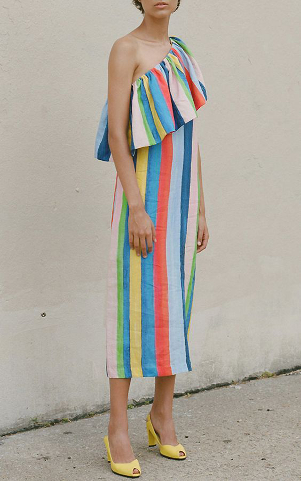 Stripes are hot this summer and there are lots of ways to wear them. Above and below some examples and you can find product suggestions at the end of this post. I LOVE this rainbow striped off the shoulder dress from Mara Hoffman (image above). There are also some other pieces by Mara Hoffman made from the same striped fabric:
