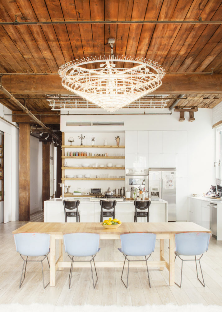 This stunning loft in Williamsburg (New York) is designed by Elizabeth Roberts Architecture. The 3,500 ft² (which is approx. 325 m²) live / work space is shared by a married couple: he is a chef and food writer and she is a sculptor. The couple found the large, industrial, ground floor space after years of searching for an industrial space