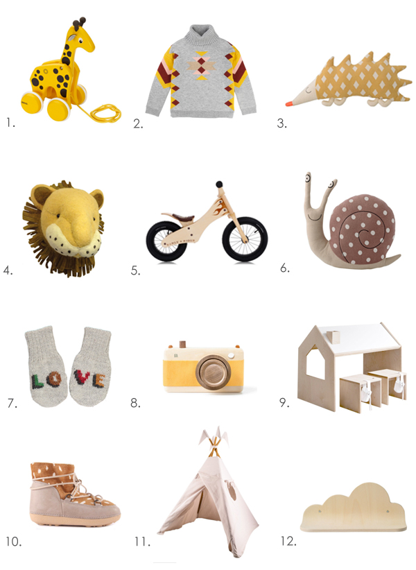 1. pull along giraffe | 2. geometric sweater by Chloe | 3. hedgehog cushion | 4. lion head | 5. Earlyrider learner bike | 6. polka dot snail cushion | 7. Love alpaca wool baby mittens | 8. wooden camera | 9. house shaped desk with stool | 10. Fur-Lined Bambi Anouk Boots Camel | 11. cotton teepee |12. cloud